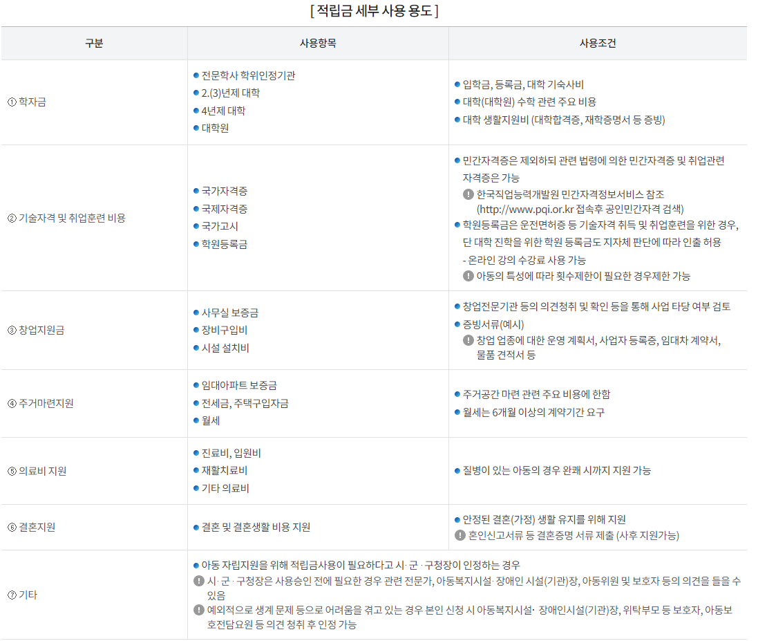 - 만 18세(만기) 이후에는 학자금, 취업 훈련비용, 창업지원금, 주거마련 등 자립을 위한 용도로 사용 가능합니다.