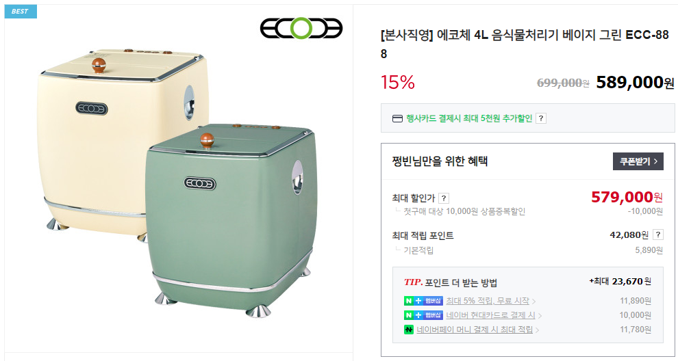 음식물분쇄기 추천 1. 에코체 음식물처리기 베이지 그린